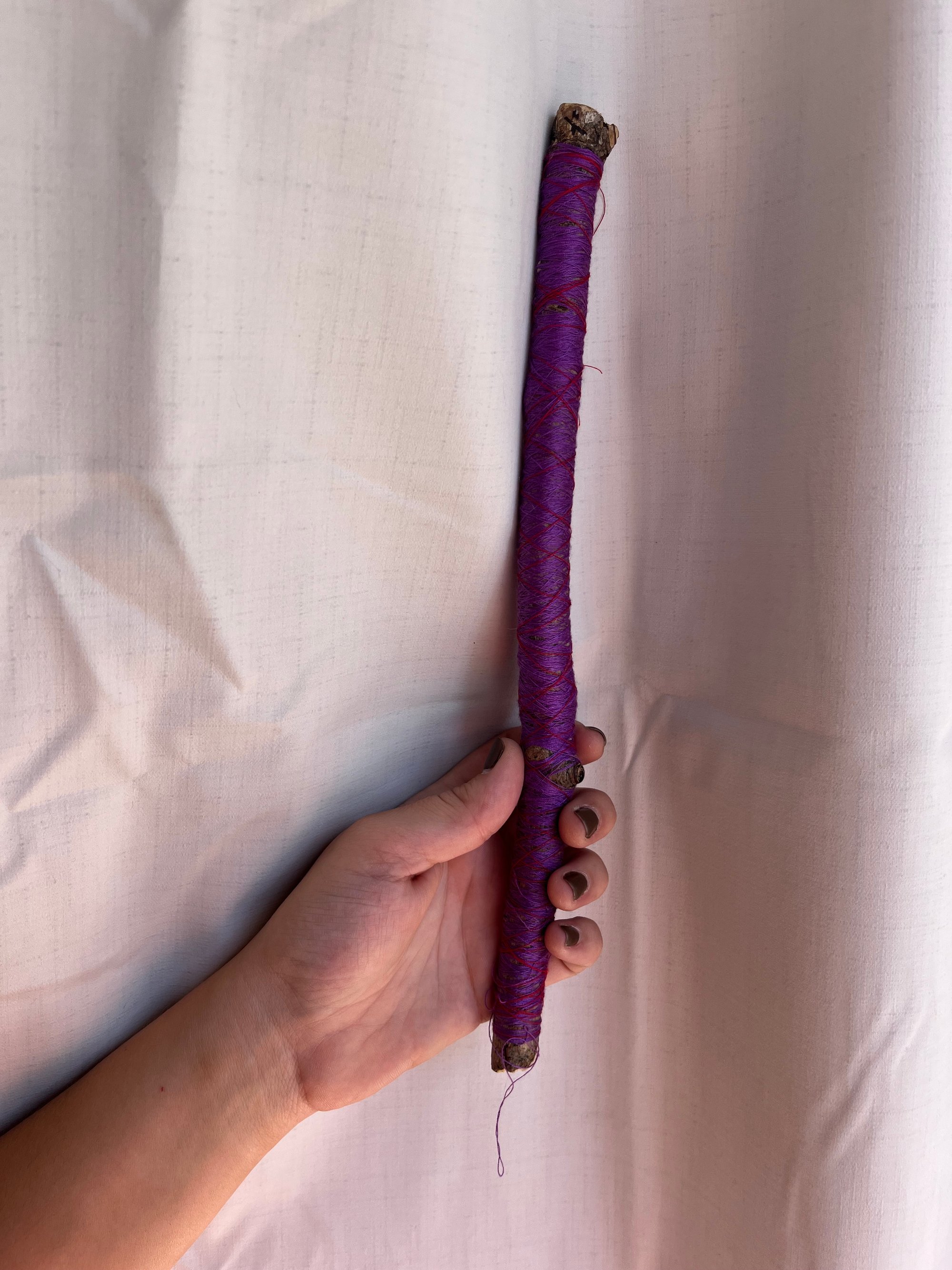 Evoke the intoxicating and inspiring spirit of Muin with this handmade stave / wand. This wand is wrapped in deep layers of thread. This is made from a foraged branch and second hand art supplies.